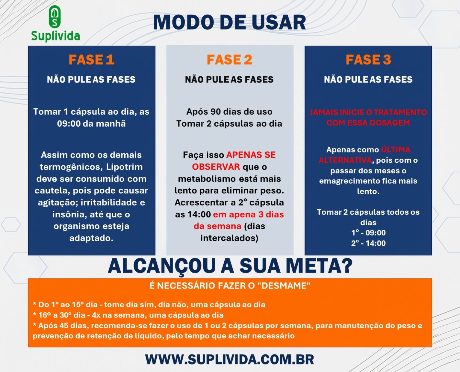 O Lipotrim é um potente acelerador de metabolismo e auxilia muito também no desinchar por ser diurético, limpando e desintoxicando o organismo.